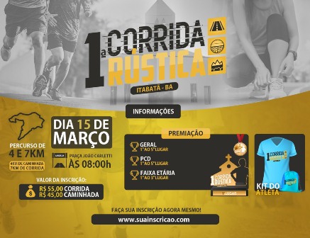 A assessoria Life Sports e a JS Treinamentos apresenta a 1ª Corrida Rústica de Itabatã – Bahia um evento que tem por objetivo incentivar a prática da atividade física e proporcionar qualidade de vida para a população local e da região. Com duas modalidades de percurso, 7 km de corrida e 4 km de caminhada acontecerá em terrenos variados: asfalto, calçamento e terra, passando pelas principais ruas e avenidas da cidade.