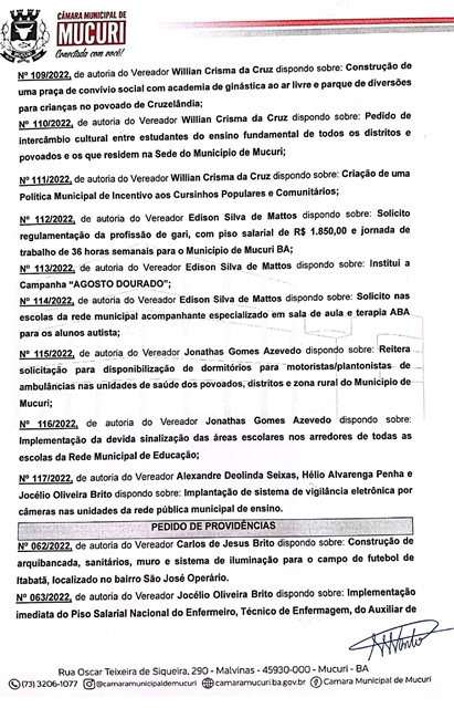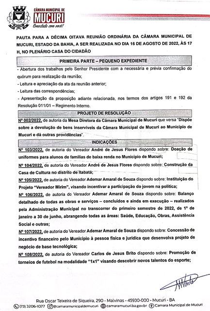 A Câmara Municipal de Mucuri publicou na ultima sexta-feira (12/08) a Pauta oficial das atividades legislativas da 18ª Reunião Ordinária de 2022, marcada para a próxima terça-feira, 16 de agosto, às 17 horas, no Plenário Casa do Cidadão.
