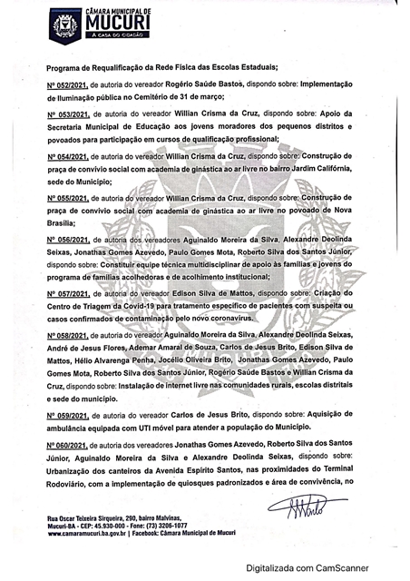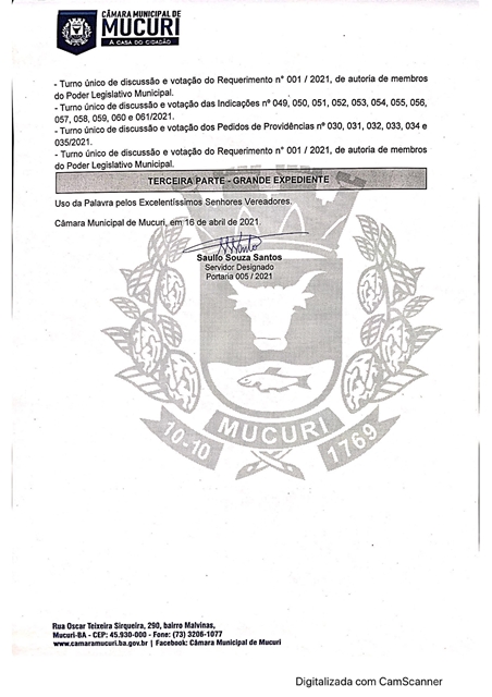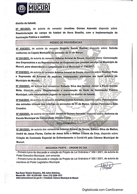A Câmara Municipal de Mucuri publicou na ultima sexta-feira (16/04) a Pauta oficial das atividades legislativas da 8ª Reunião Ordinária, marcada para a próxima terça-feira, 20 de abril de 2021, às 16 horas, no Plenário Casa do Cidadão.