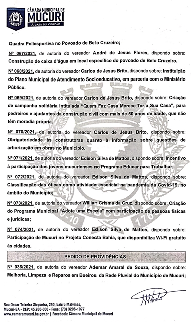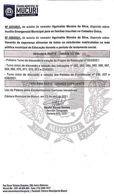 A Câmara Municipal de Mucuri publicou na ultima sexta-feira (23/04) a Pauta oficial das atividades legislativas da 9ª Reunião Ordinária, marcada para a próxima terça-feira, 27 de abril de 2021, às 16 horas, no Plenário Casa do Cidadão.