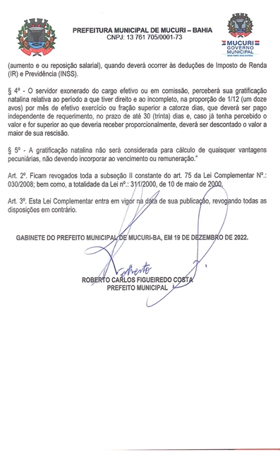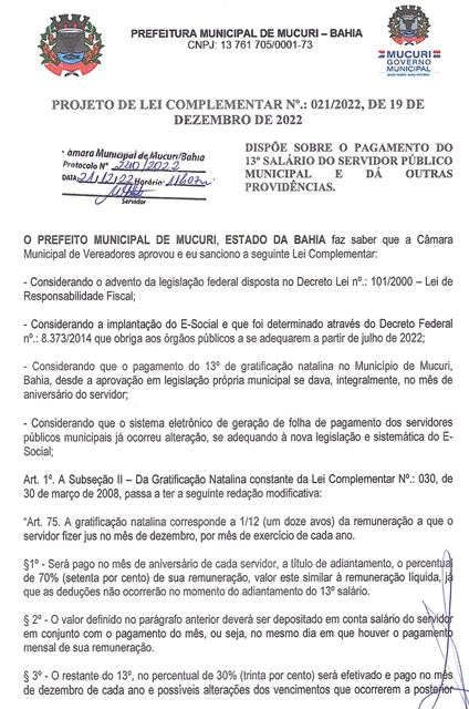 Nesta terça-feira, 27 de dezembro, às 9h da manhã, a Câmara de Mucuri realiza Reunião Extraordinária para análise, discussão e votação do Projeto de Lei Complementar (PLC) nº 021/2022, de autoria do Chefe do Poder Executivo Municipal, que dispõe sobre o pagamento do 13º salário do servidor público municipal.