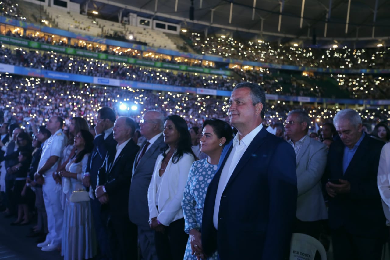 O governador Rui Costa participou da celebração, acompanhado da primeira-dama e presidente das Voluntárias Sociais da Bahia (VSBA), Aline Peixoto, e de José Maurício Moreira e Cláudia Araújo, que receberam a graça da cura, reconhecida pelo Vaticano.