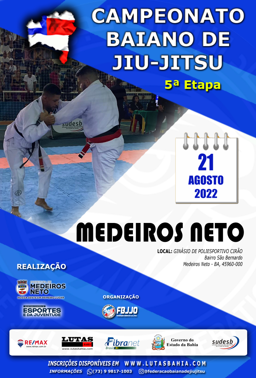 A Prefeitura de Medeiros Neto, através da Secretaria Municipal de Esportes e da Juventude, irá promover uma das etapas do Campeonato Baiano de Jiu-Jítsu 2022. O evento, inédito na cidade, acontece no dia 21 de agosto, no Ginásio de Esportes Cirão.