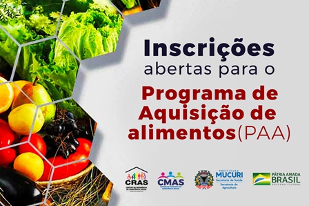 A Prefeitura Municipal de Mucuri, por meio da secretaria de Assistência Social e da secretaria de Agricultura dará início ao cadastramento dos fornecedores beneficiários da próxima etapa do Programa de Aquisição de Alimentos (PAA), do Governo Federal. Desde 2013, Mucuri, faz parte do Programa, mas somente este ano, o Governo Federal disponibilizou sua expansão, que foi imediatamente aceita pela Secretaria de Assistência Social em parceria com a Secretaria de Agricultura.