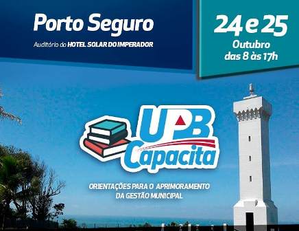 Porto Seguro, no Extremo Sul da Bahia, recebe nos dias 24 e 25 de outubro o UPB Capacita: Orientações para aprimoramento da Gestão Municipal. O evento, realizado pela União dos Municípios da Bahia (UPB), acontece no Hotel Solar do Imperador, na Antiga Estrada do Aeroporto, das 8 às 17 horas. As inscrições podem ser feitas no site da UPB e são gratuitas para municípios associados à entidade.