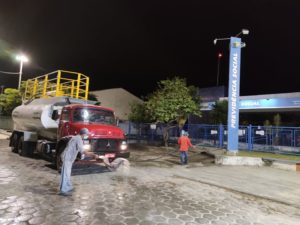 Em mais uma ação de combate ao avanço do Coronavírus em nosso município, a Prefeitura de Mucuri realizou no final de semana de 16 a 17 de maio, a limpeza química com um caminhão pipa abastecido com 10 mil litros de cloro (hipoclorito de sódio) nos locais onde, normalmente, há o maior fluxo de pessoas nas ruas de Mucuri/Sede e em Itabatã.