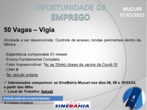 O SINE – Serviço de Integração para o Trabaho em Mucuri está anunciando 80 vagas de emprego distintas para empresa privada.