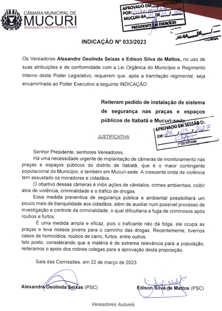 Segundo os autores, “há uma necessidade urgente de implantação de câmeras de monitoramento nas praças e espaços públicos do distrito de Itabatã, que é o maior contingente populacional do Município, e também em Mucuri-sede. A crescente onda de violência tem assustado os moradores e cidadãos.”