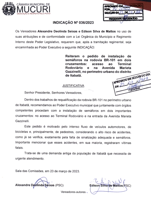 Os Vereadores aprovaram duas Indicações assinadas em conjunto por Alexandre Deolinda Seixas (Xandão Seixas – PSC) e Edison Silva de Mattos (Sula – PSC), durante a 5ª Reunião Ordinária, realizada nesta terça-feira (28/03) no Plenário Casa do Cidadão
