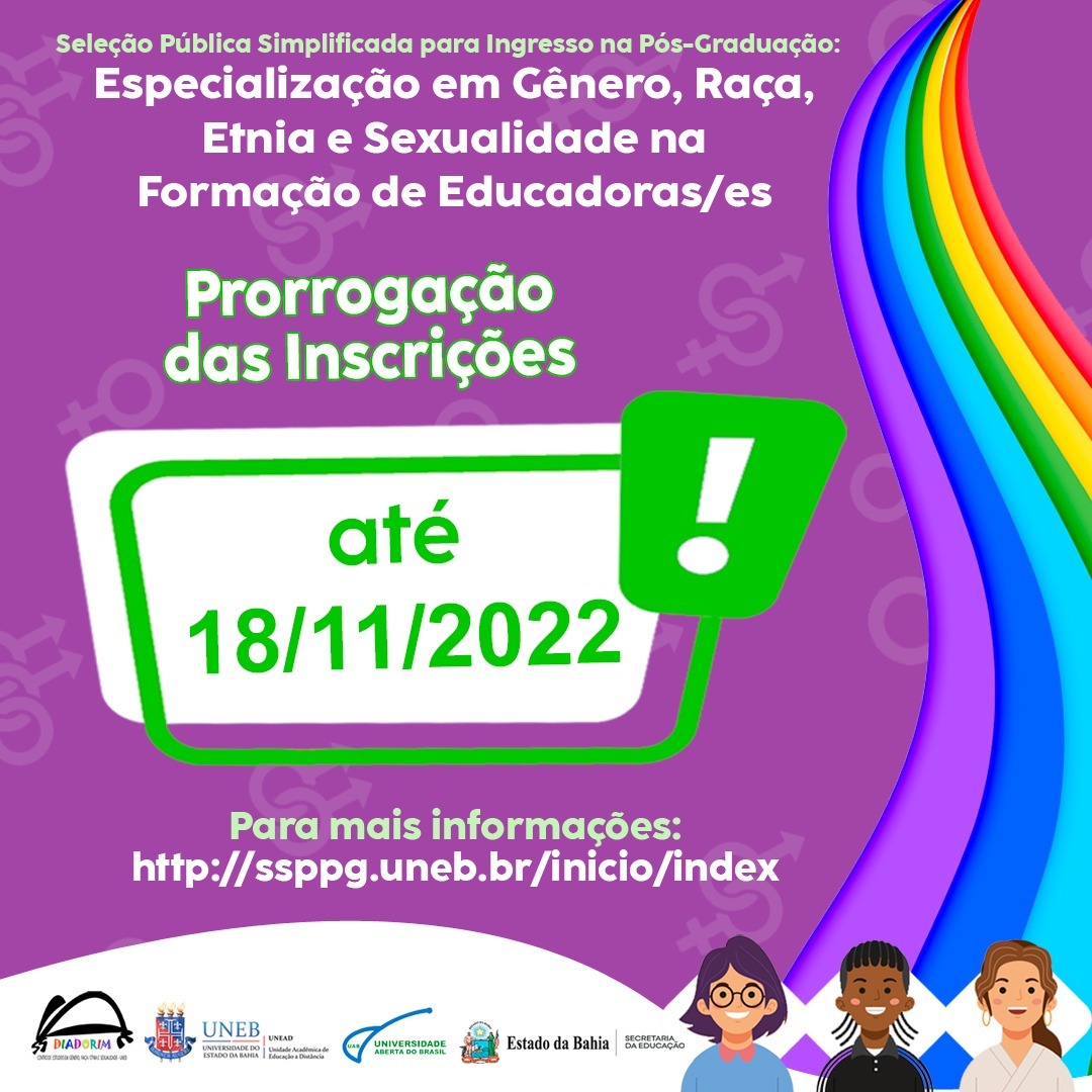 A formação que contará com carga horária de 570h, terá início em 2023.1 e será ofertada na modalidade de Educação a Distância (EaD) com duração de 18 meses. A Especialização é uma articulação entre o Centro de Estudos em Gênero, Etnia e Sexualidade (CEGRES Diadorim), a Unead, a SEC-Ba e a UAB.