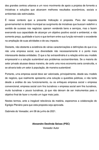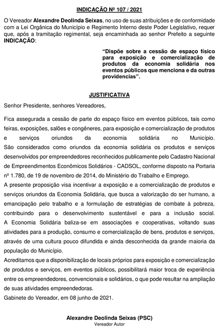 A primeira trata da criação do “Certificado de Impacto Social” pelo Município, para valorizar empresas, associações e cooperativas, enquanto a segunda pede a cessão de espaço físico para exposição e comercialização de produtos da economia solidária.